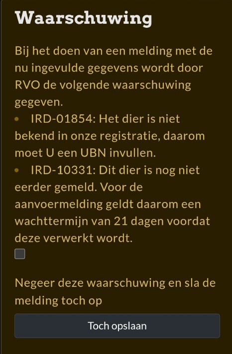 De nieuwe eigenaren krijgen bij registratie hierop een waarschuwing dat de registratie niet op orde is en zij een UBN moeten aanvragen.